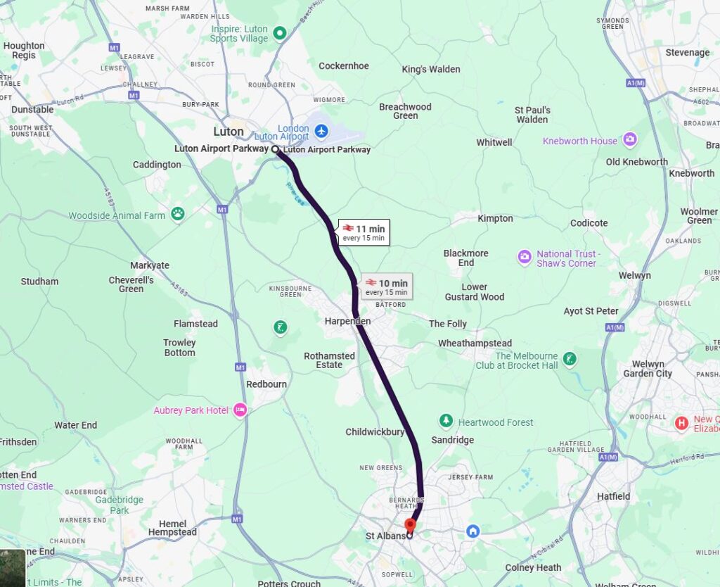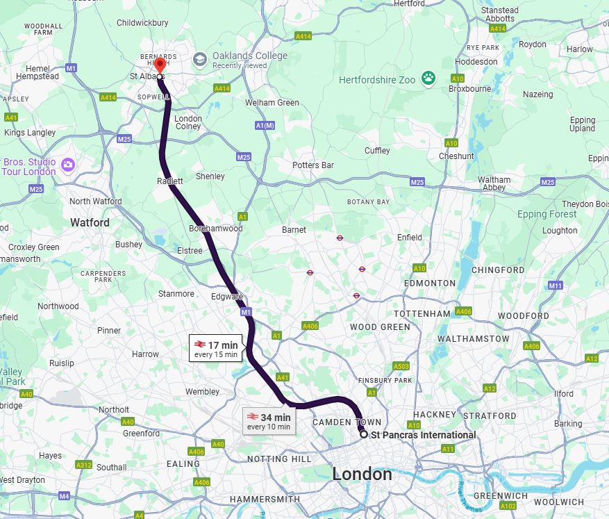 St Albans Train Station has direct links to Kings Cross and Luton Airport and takes roughly 17 minutes (fast train) from London